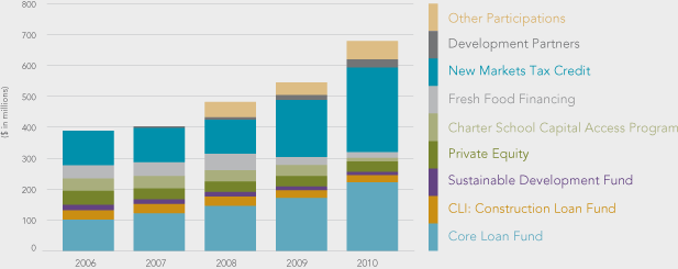 Loans and leases outstanding increased by $8 million (5.5%) to total $151 million in 2010 driven by loan closings of $83.7 million. We had increases in most program areas including supermarkets ($9.6 million), commercial real estate ($2.9 million), and charter schools and other community facilities ($4.2 million). Housing receivables declined by $6.2 million due to reduced origination volume resulting from the challenged residential real estate market. Net loan charge-offs totaled $1.9 million or 1.26% of total loans and leases outstanding, in line with the average for U.S banks. Two-thirds of TRF charge-offs are offset by dedicated grant funds raised for such purposes.
